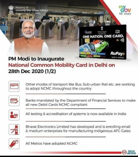- In all transit locations, NCMC can be used, making all new metro and transit payments interoperable with one card.