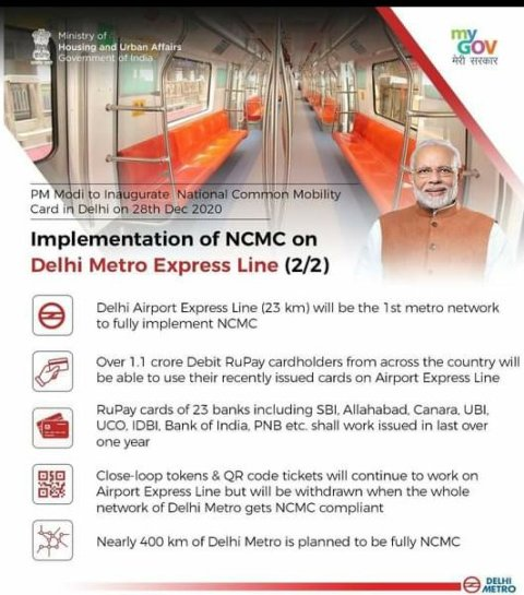 The essential National Common Mobility Card (NCMC) service for the Delhi Metro Airport service line has been launched by Prime Minister Narendra Modi. It is part of a One Nation One Card initiative by the Prime Minister. For making payments, people will be able to use NCMC.